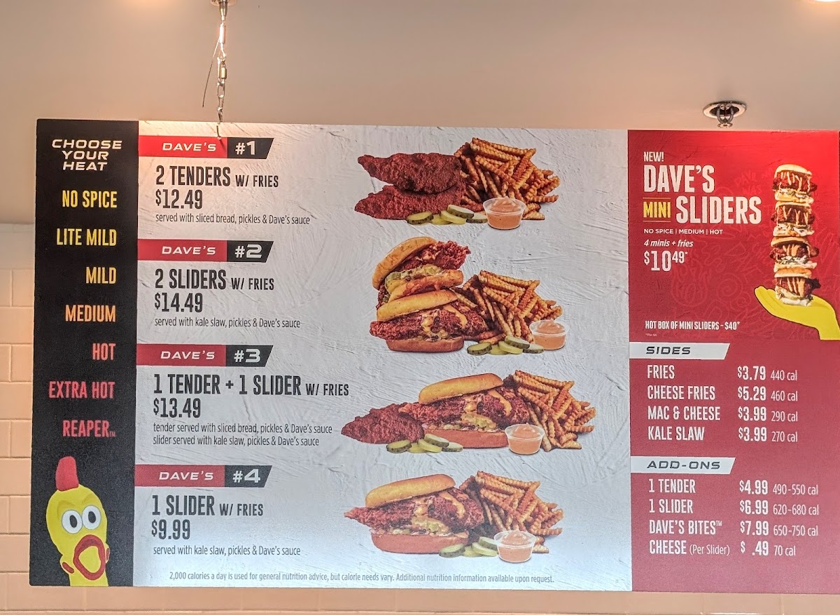 Dave's Hot Chicken delivers a bold, flavorful experience centered around their signature spicy chicken tenders. The menu keeps it simple yet satisfying, highlighting perfectly seasoned chicken served in various forms—classic tenders, sliders, or piled high on plates. Noteworthy is the Dave's NOT Chicken (Cauli)™ lineup, featuring large cauliflower-loaded fries and vegan sliders that bring a creative twist for plant-based diners. Each dish is elevated with their iconic Dave’s sauce, which balances heat and savoriness beautifully.